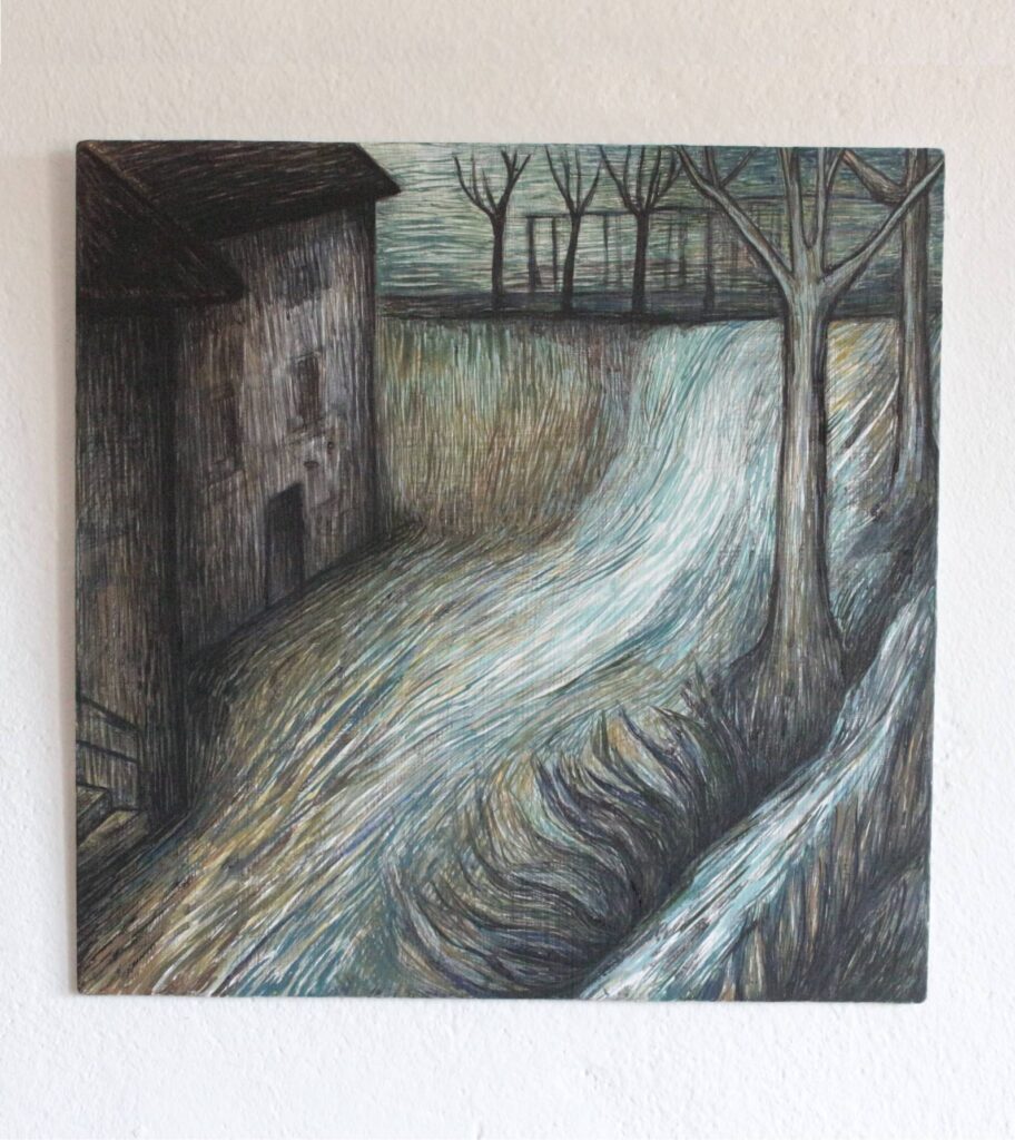 Alluvione 2025 acrilico e inchiostro su dibond 27,4×27,4 cm