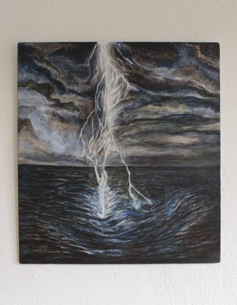 Fulmine 2025 acrilico, inchiostro e bitume su dibond